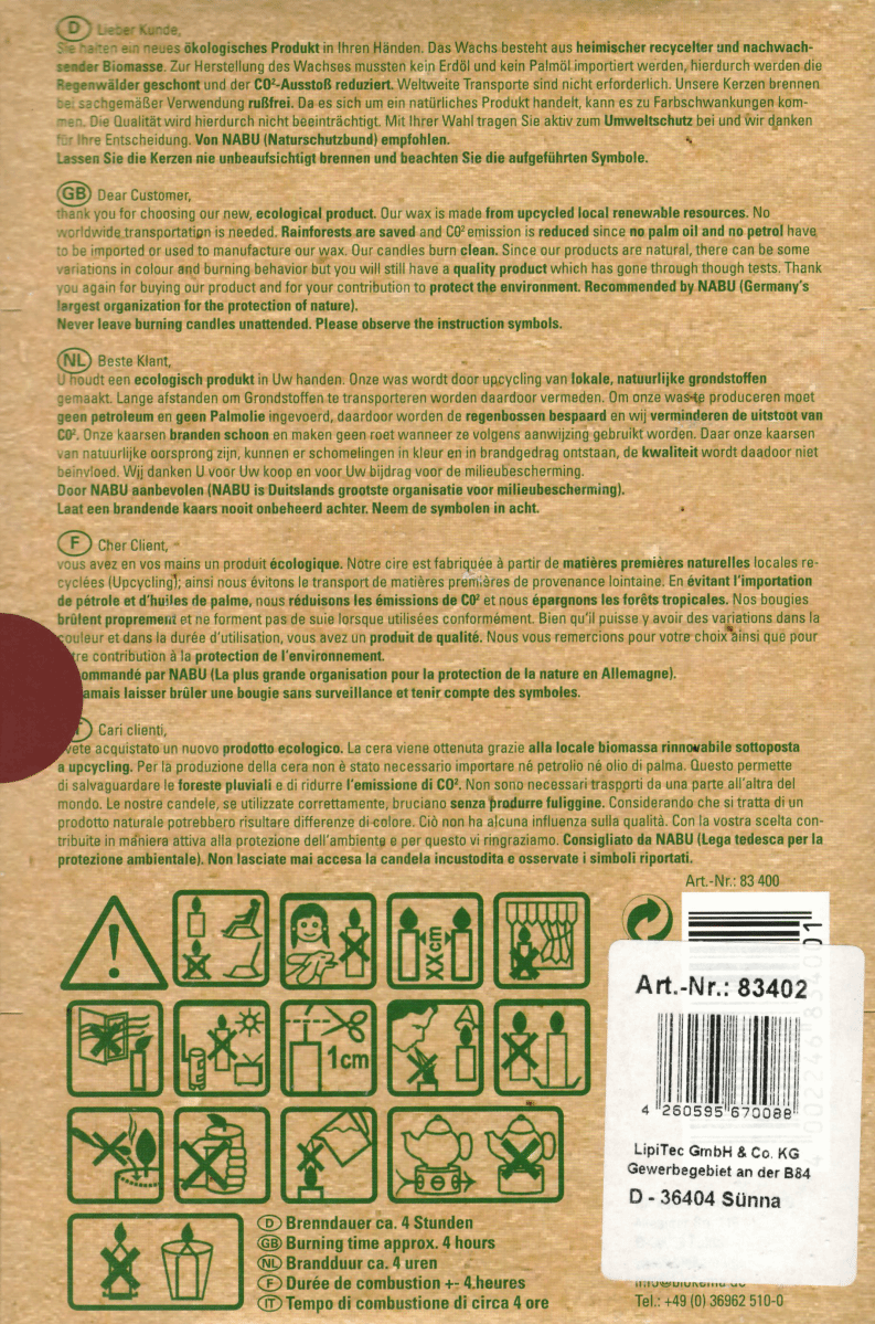 Auch wenn der Rohstoff Abfall ist sind die Kerzen 100% unbedenklich und werden vom Hersteller auf Qualität uns Sicherheit überprüft. (Wir sind in Deutschland ;-))